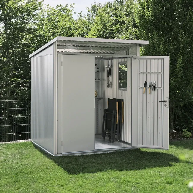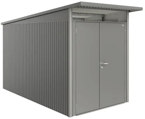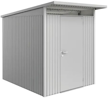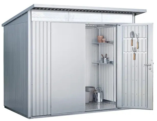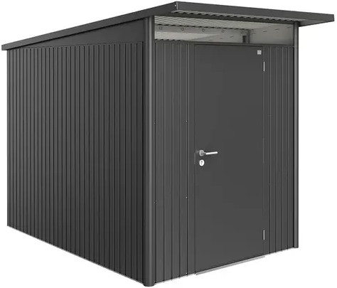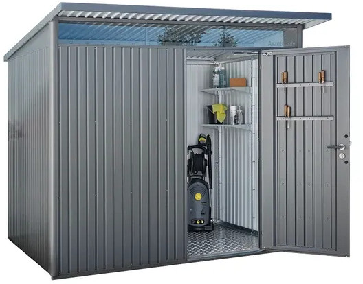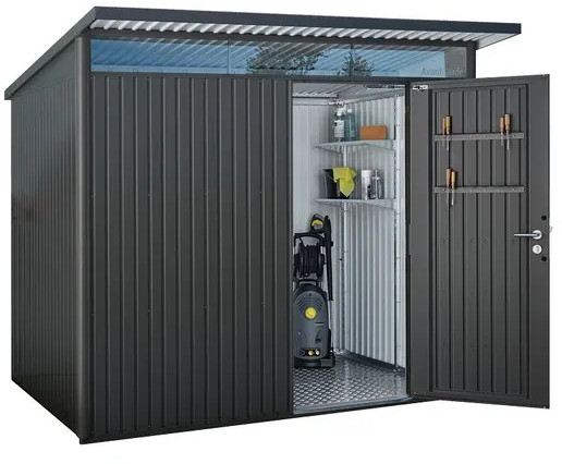 La casetta AvantGarde unisce una struttura dall'aspetto dinamico con la massima praticità e resistenza dell'acciaio. Il tetto sporgente protegge l'ingresso e dona un tocco di rigore industriale.